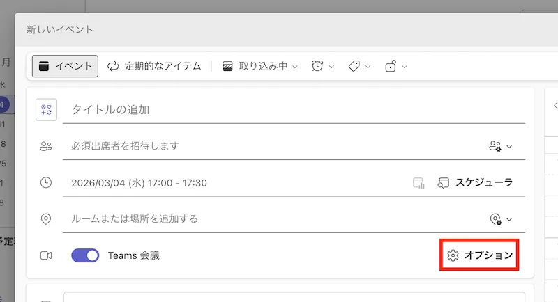 • 新しいイベントとして作成する場合「Teams会議」のトグルがオフであればオンにしてください.