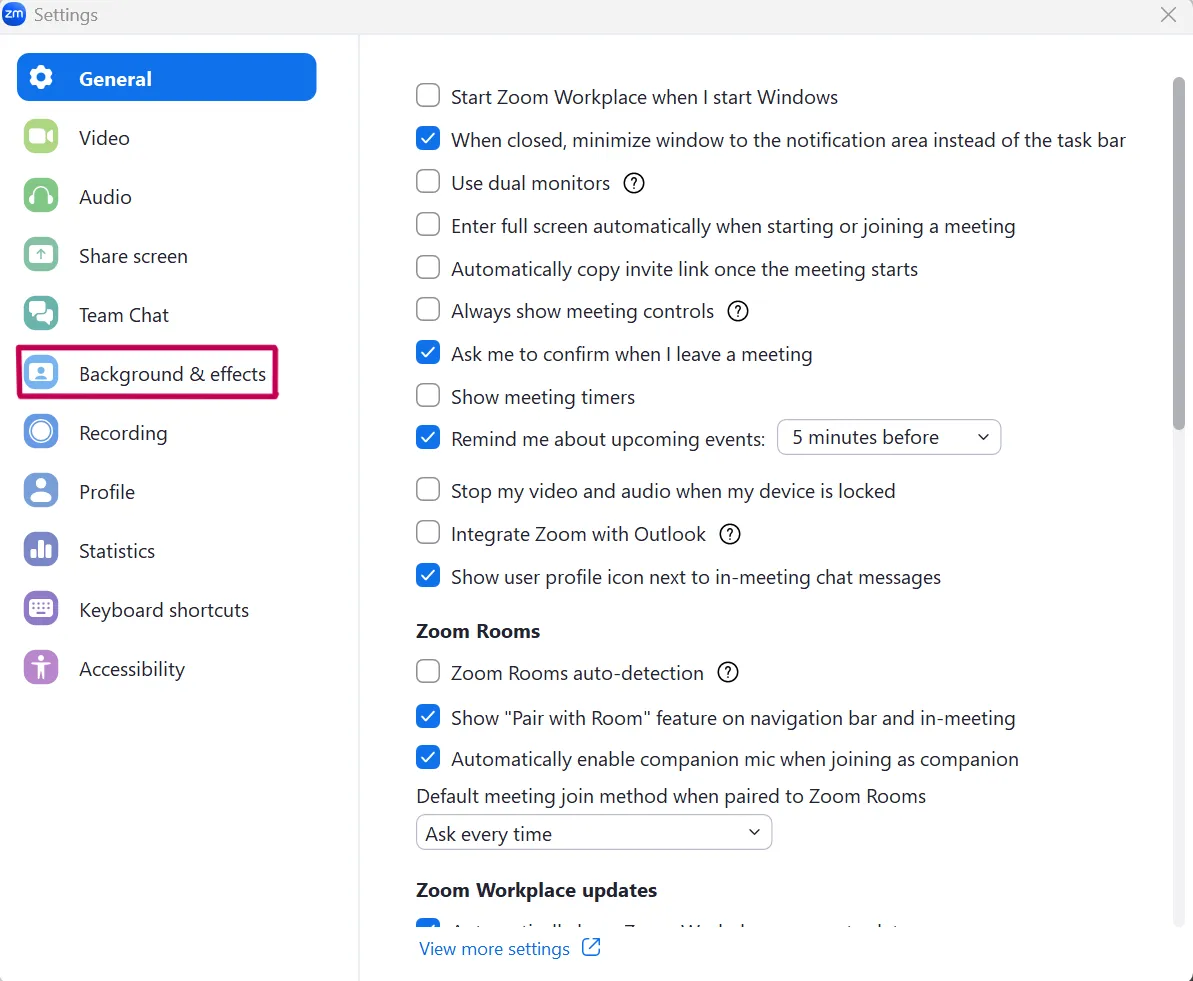 1. Launch the Zoom application, open “Settings” and select “Background & effects”.