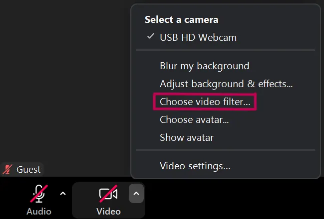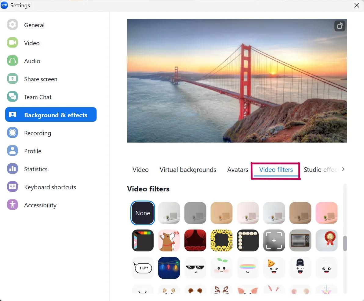 3. Select the video filter of your choice. (Unlike virtual backgrounds, the video filters do not allow you to upload original images, etc.)