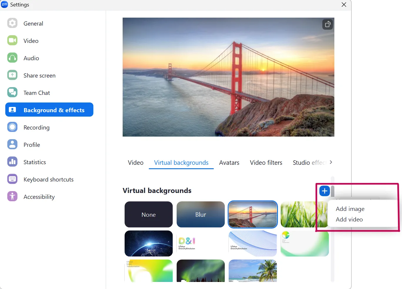 The virtual background feature allows you to project an image or video of your choice as a background during a Zoom meeting. By setting up a virtual background, you can prevent privacy-related images, such as those of your own room, from being shown during a camera-on meeting, or create a suitable environment for a meeting. If you set up a virtual background before the meeting, the virtual background will automatically appear when you turn on the camera during the meeting. It can also be activated during the meeting, even if it is not set before the meeting.