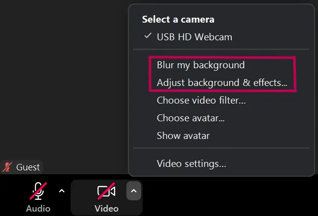 2. Select “Adjust background & effects…” from the menu. If you want to blur the background, select “Blur my background”.