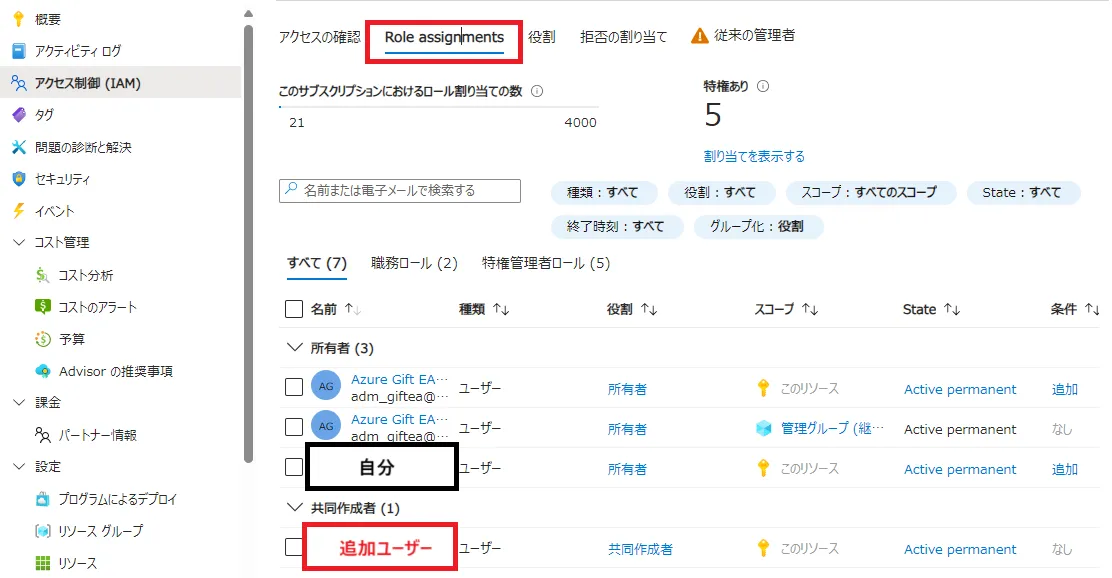 Role assignmentsタブをクリックしてください. - 切り替わった画面に,追加したメンバーが正しいロールで追加されていることを確認してください.