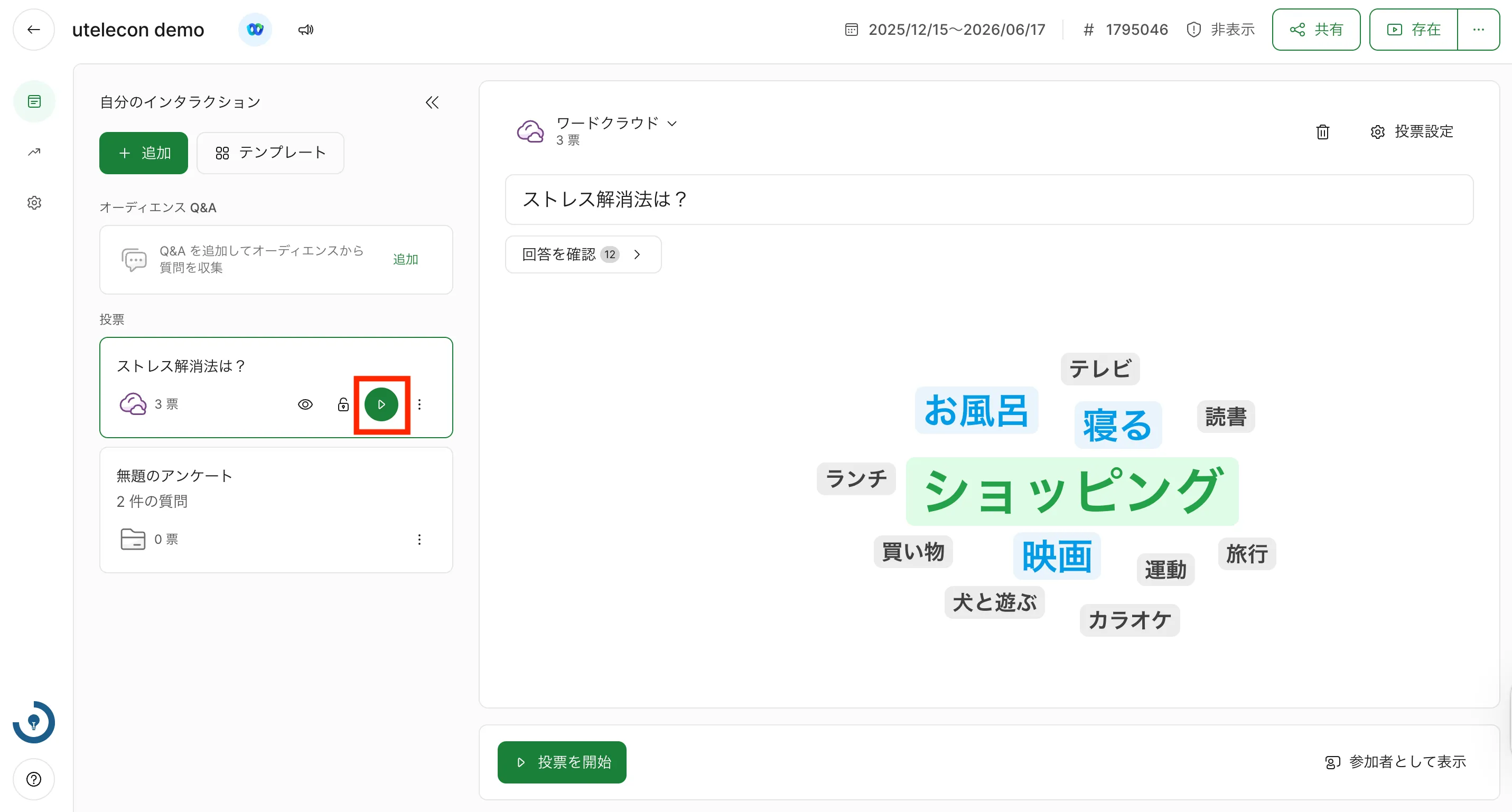 赤いボタンをクリックすると,画面右側に表示されていた投票が終了します.再度参加者への投票の表示を行いたい場合は,画面左側の投票についている緑色のボタン(元々赤色のボタンだったもの)をクリックして下さい.