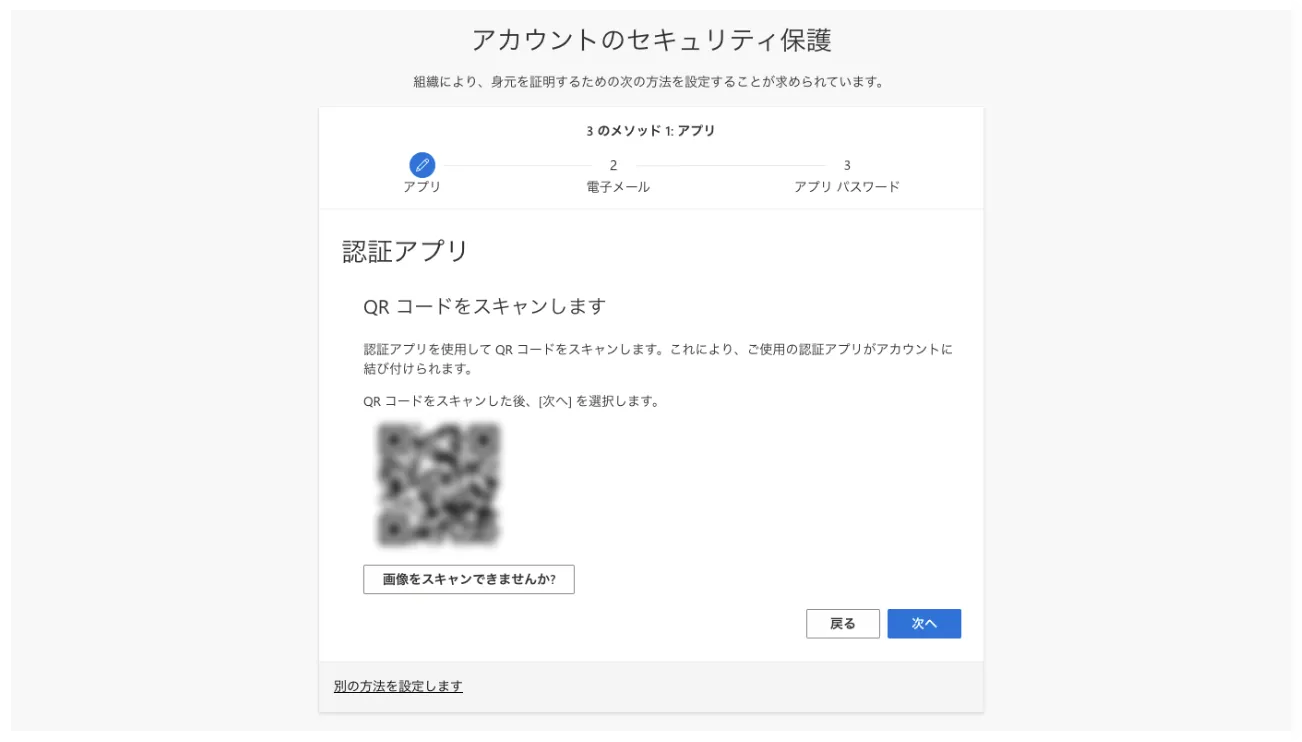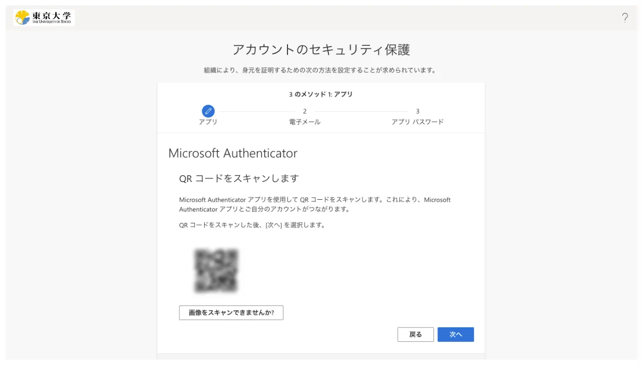 - 「アプリでアカウントをセットアップする」という画面が表示されるので,さらに「次へ」を押してください.QRコードが表示されます.