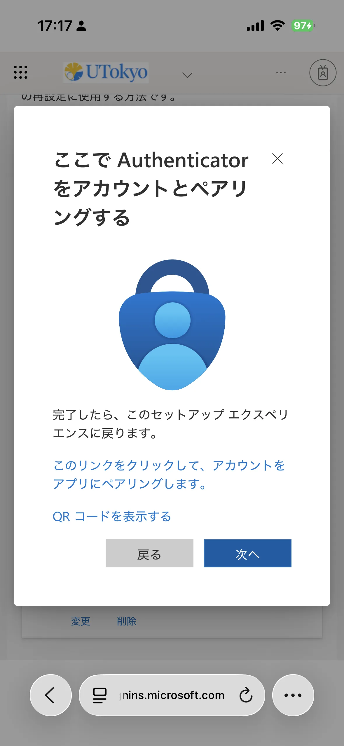 - スマホでこの作業をしている場合:「このリンクをクリックして、アカウントをアプリにペアリングします。」を押してください.Microsoft Authenticatorアプリに移動し,自分のUTokyo Accountが表示されればOKです.元の画面に戻って「次へ」を押してください.
