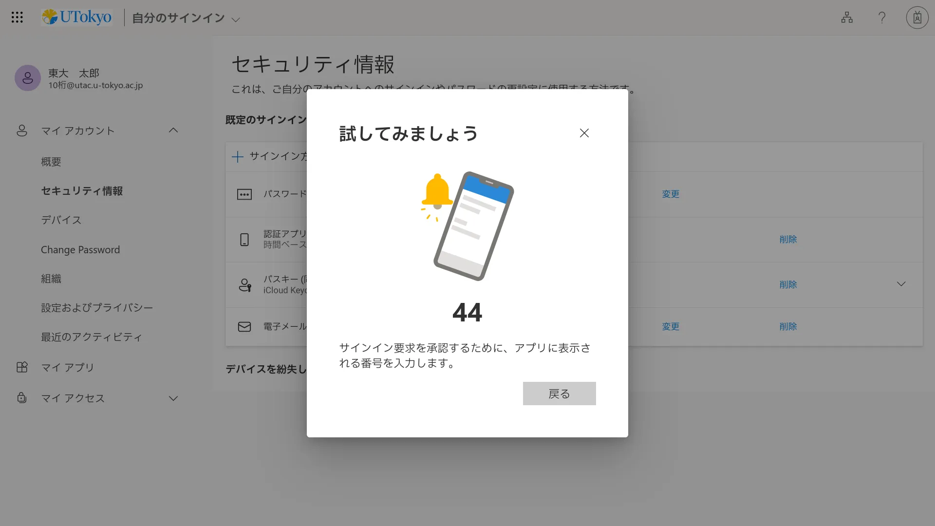 @utac.u-tokyo.ac.jp)とパスワードを入力してください. - 続いて多要素認証の本人確認が行われます.本人確認方法により手順が異なりますので,画面の指示に従って操作してください.